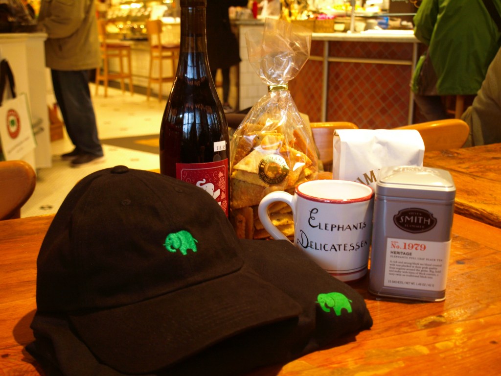 What they offer is a wide selection in specialty foods and traditional American fare. The word “wide” is a bit of an understatement though. You will find a cocktail bar, a coffee bar, a dessert bar, a salami and cheese bar, a hot items counter (including pizza made fresh from the wood fire oven), a cold items case (which stretches on for an eternity) and more. They display their insane amounts of food in glass cases all over the restaurant, which is technically a deli, but is also a gift shop! Sound confusing? It may be a bit overwhelming at first, but after about five minutes in the food museum, you will find yourself acting like a kid in a candy store with all of the choices that lay before you. And did I mention they have a refrigerated section as well? That’s right. Don’t have time to sift through the million choices they offer at Elephants? Why not grab something on the go from their fridge and take it with you to eat on your way to work or home? They have salads, sandwiches, and another vast array of items leaving you in a tizzy from all the choices!