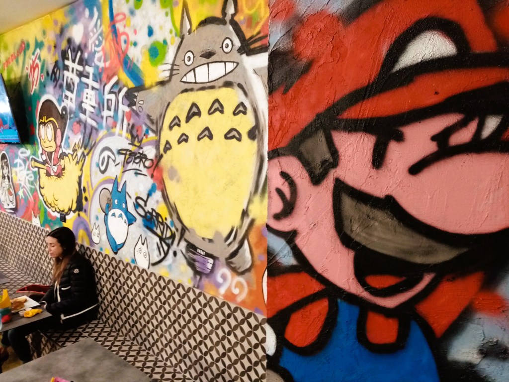 The walls are graffitied with animation, including Pac Man and other notable animation characters.