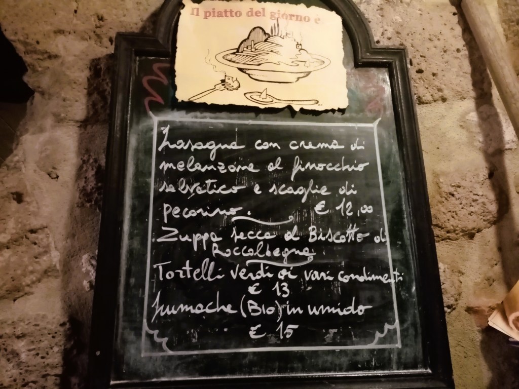 To start, the atmosphere and décor are definitely something to be acknowledged here. The village of Sorano, which dates back to between the 3rd-4th centuries B.C. is a hilly town that is a maze of a place. Anywhere and everywhere around the town is a steep climb up ancient staircases and steps, and the navigation is difficult if you’re not from around here. I started at the top of a staircase in the village with a sign pointing to the osteria, only to find myself descending step after step, landing after landing and turning corner after corner to locate the establishment – which told me I’d be burning off my dinner’s calories on my way back up.