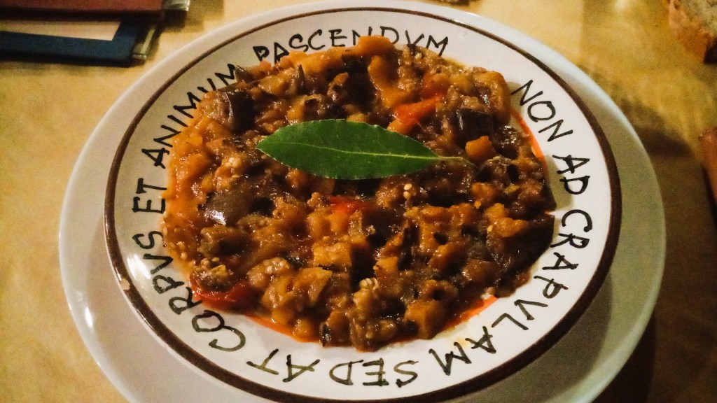 Let’s begin with the Sovana DOC which was served in an old fashioned decanter, much to my delight. Not only was it aromatic and lovely but it was an excellent start to the evening. My first dish was stewed eggplants with peppers and tomatoes with sweet and sour pears. Extremely tasty with lots of strong flavors from the eggplant and peppers.