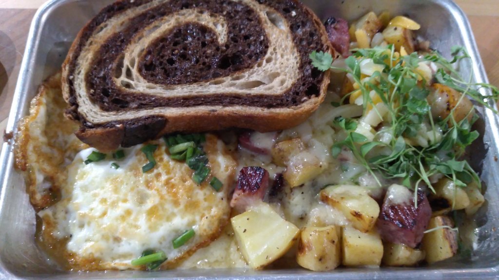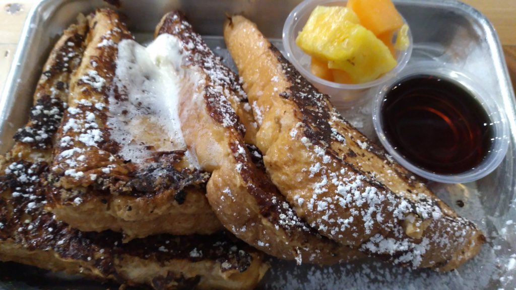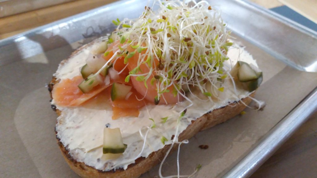 Their specialty of the house? ‘All I Avo Wanted’. Sliced avocados, jammy soft-boiled egg, pickled watermelon radish, alfalfa sprouts, ginger chili oil, black salt & pepper on 9 grain toast. Wow. That’s a mouth full. Both reading the description and eating it! Their most popular dish though is their ‘ Don’t Get Salty’ item. Again, an avocado toast, but a very different creation. I myself highly enjoyed this one. And their best-selling breakfast/brunch entrée is their ‘All-Day B.A.E.’ This dish consists of bacon and two eggs with queso fresco, avocado slices, and black bean spread over toasted rye, served with fruit.