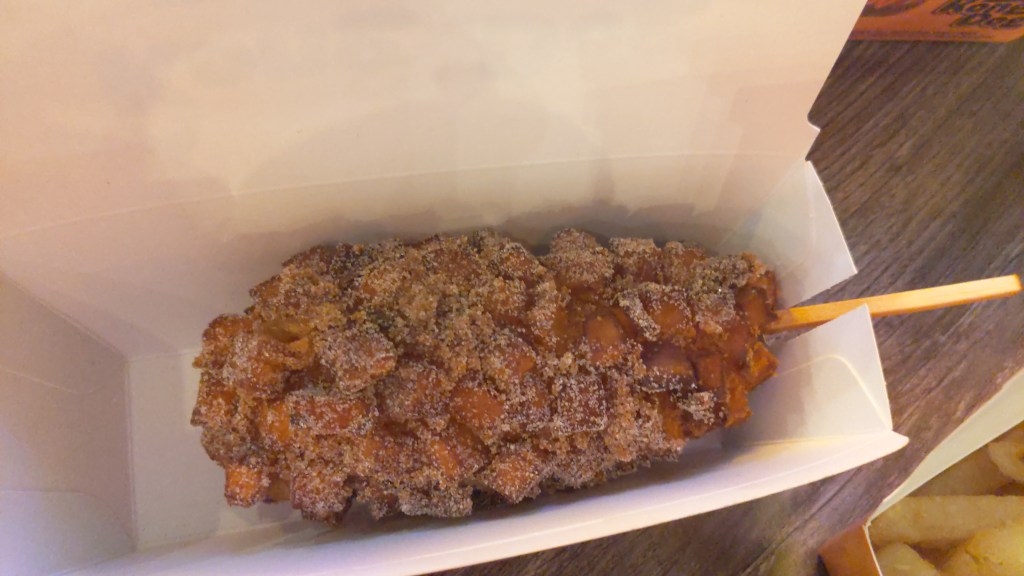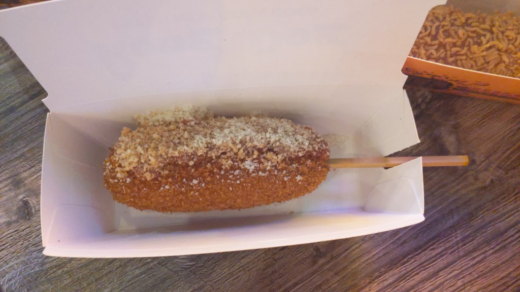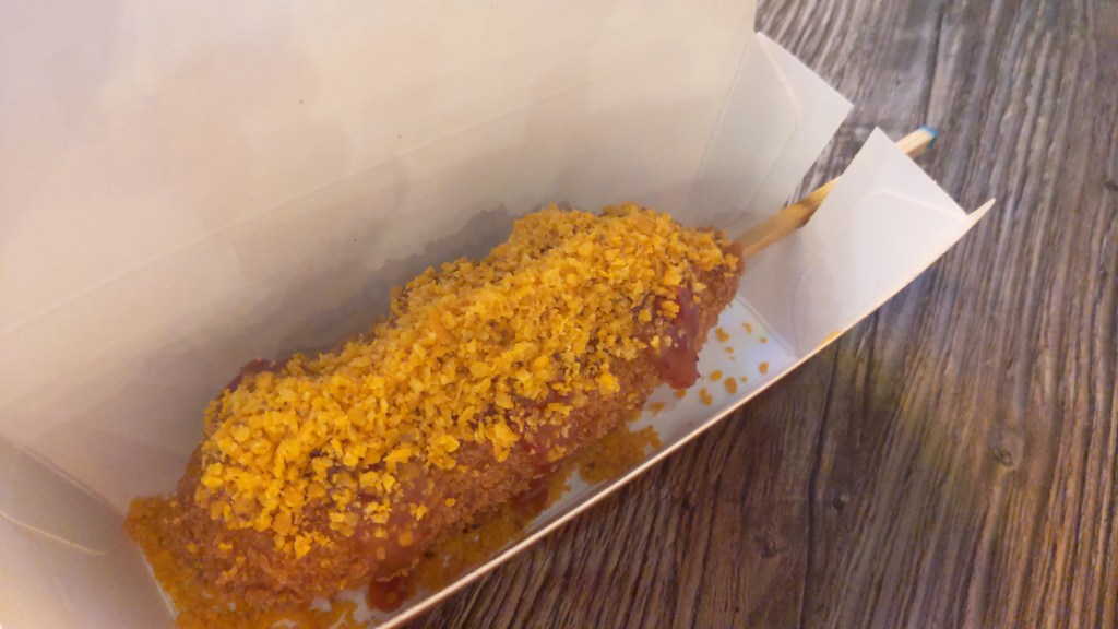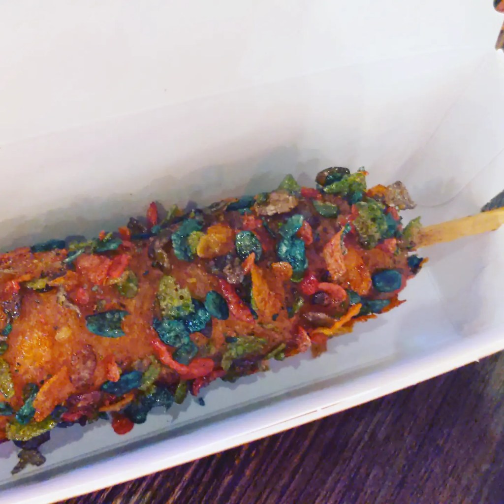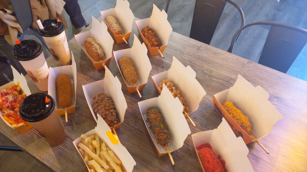 The corn dogs are deep fried, with either a hot dog in the center, a vegan-friendly plant-based “hot dog”, or just simply cheesy goodness, followed by smothering the already deep fried substance in something else – whatever that may be.