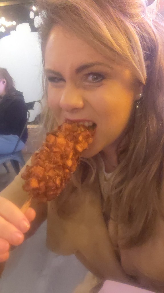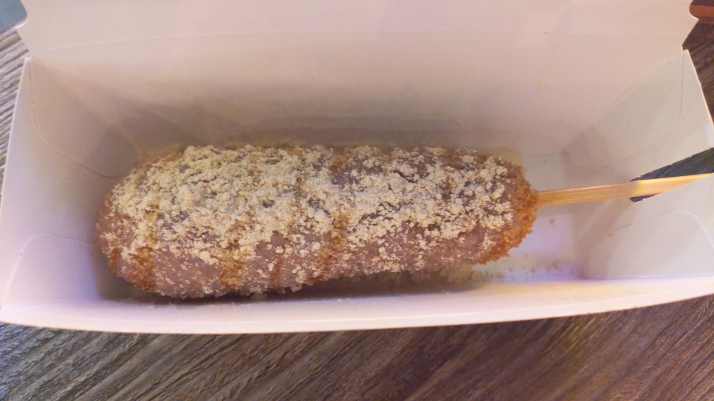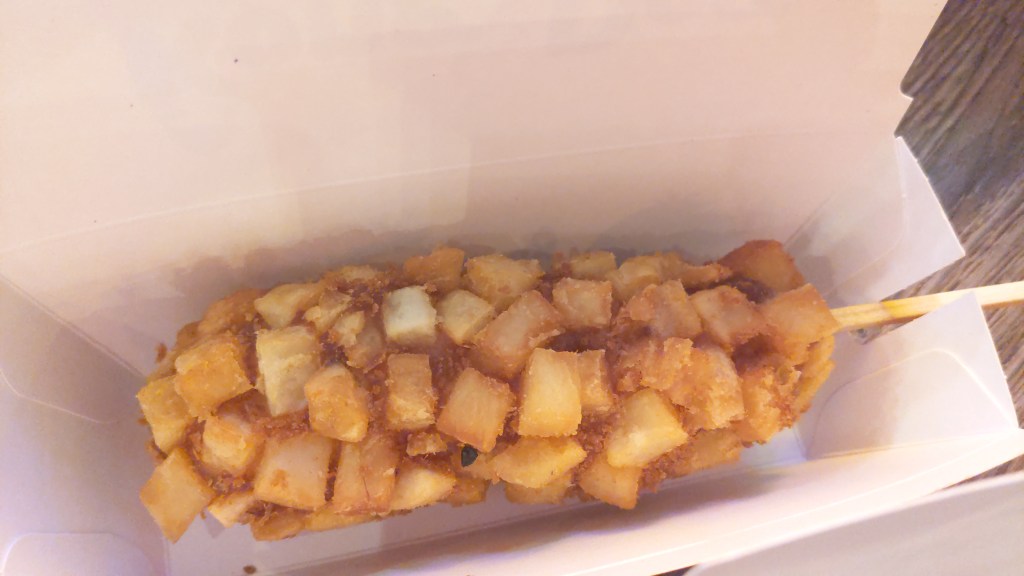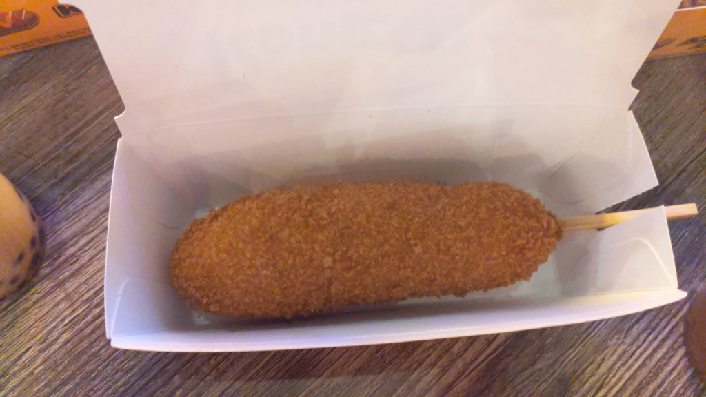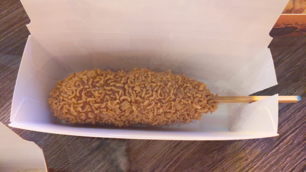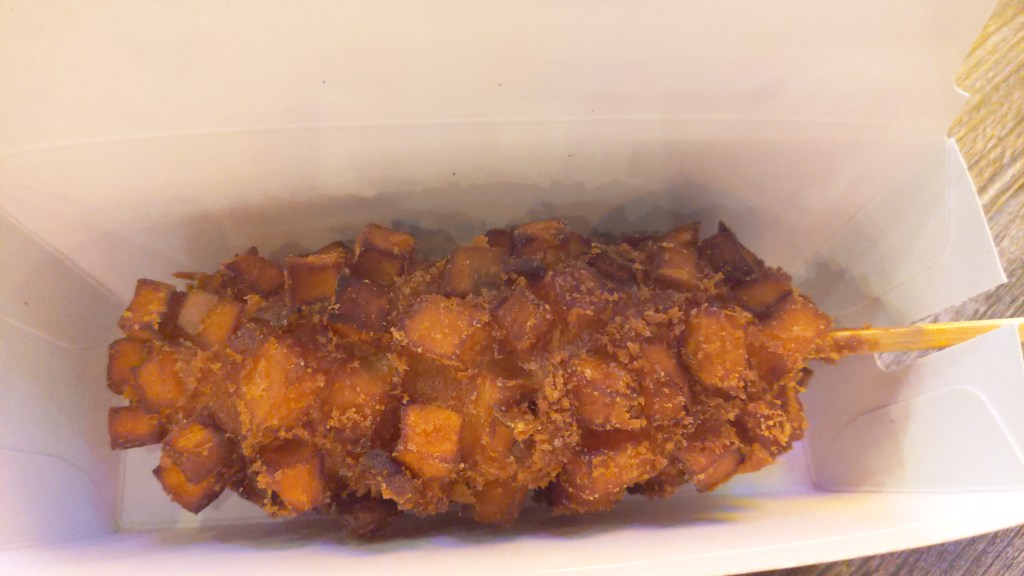 The corn dogs are deep fried, with either a hot dog in the center, a vegan-friendly plant-based “hot dog”, or just simply cheesy goodness, followed by smothering the already deep fried substance in something else – whatever that may be.