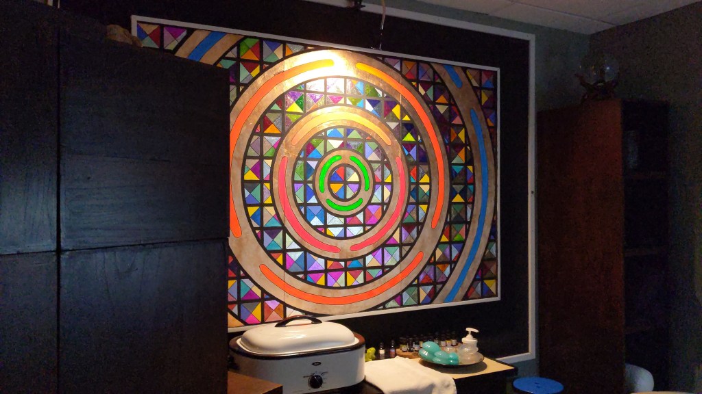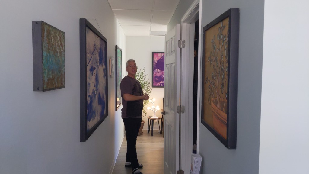 And if you’re interested in seeing some of his work now rather than wait for that space to be built, you’re in luck. He already features some of his pieces on display throughout the massage studio.