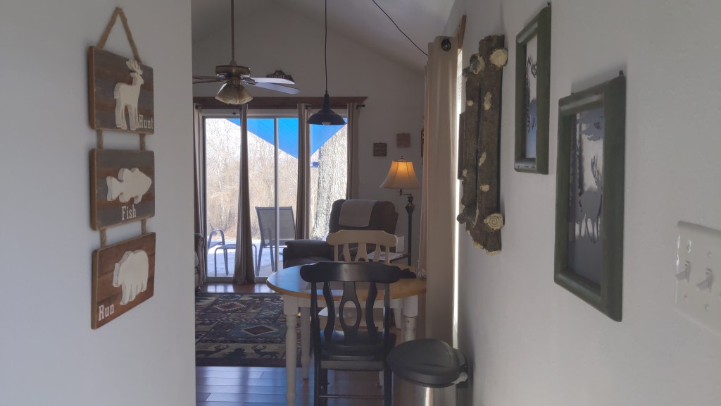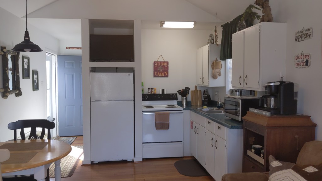 “We offer an onsite laundry room, air conditioned bathhouse, two rec rooms, and 1.5 acre green space for dogs and guests to roam with a horseshoe pit and a disc golf goal to practice your game. All of our hotel rooms have a 50 inch smart tv with expanded cable plus Cinemax suite of movies and each motel room has a small dining area with microwave, mini fridge and coffee pot. Our two cabins both have a queen bedroom, a queen sleeper sofa and comfy La-z-Boy recliner in the living ro0om, and a stocked kitchen with most utensils needed in your home away from home.”