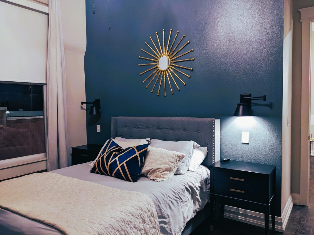 From the tile in the bathroom, to the backdrop behind the television in the living room, to all the bright colored furniture in the main room which countered so exquisitely with the black and white kitchen – her work is so beautiful and simultaneously brilliant, I can’t say enough positive things about it.